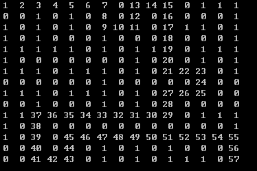 us.Merge((ty1 - 1)*x + tx1, (ty2 - 1)*x + tx2); } COORD pos = { 0, 0 }; SetConsoleCursorPosition(GetStdHandle(STD_OUTPUT_HANDLE), pos); for (int j = 1; j < y*2 ; ++j) { for (int i = 1; i < x*2; ++i) { printf("%c", map[j][i]); } printf("n"); }